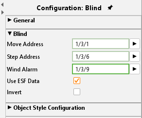 The blinds element serves as a control element for blinds. Blinds are controlled by EIS 7 (1Bit).