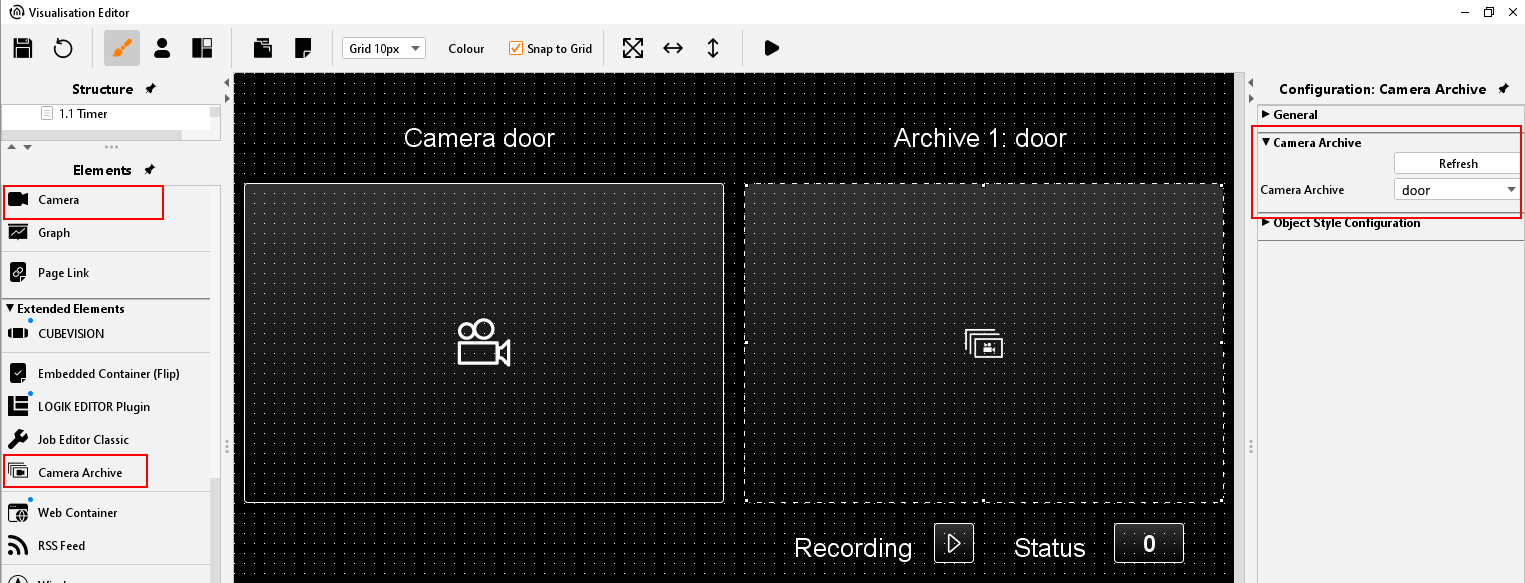 With "Recording)" the trigger of the logic element camera archives was inserted into the visualization. The "Status" is displaying the status of the logic element.
