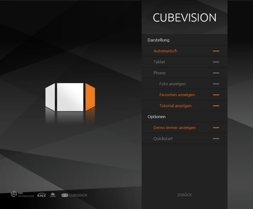 CUBEVISION offers two types of presentation. "Tablet" means the 3D cube presentation for devices with larger displays, "Phone" means the presentation for smaller displays, such as in smartphones. If you select the setting "Automatic", CUBEVISION automatically selects the corresponding presentation depending on the resolution. The visualisation automatically scales the screen size.