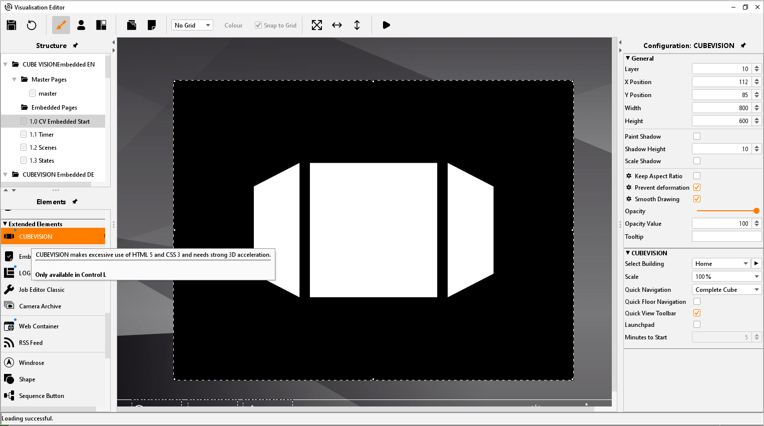 The "CUBEVISION" visualisation element is used to embed CUBEVISION into an individual CONTROL L visualisation. In this way, functions of the CONTROL L visualisation and CUBEVISION can be combined.