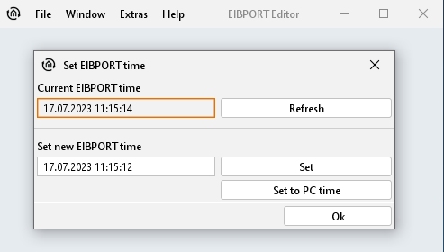 This menu item allows you to adjust time and date setting. The first line shows you the current date and time of your EIBPORT. Below this line, you can set a new date and a new time. This can happen directly with your keyboard, or you will press the button âSet new eibPort timeâ, which transfers actual time from your PC to your EIBPORT.