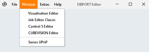 With the help of menu item âwindowâ, you can change between offered editors. Furthermore, you can find a link to the configuration surface of EIBPORT, the ConfigTool