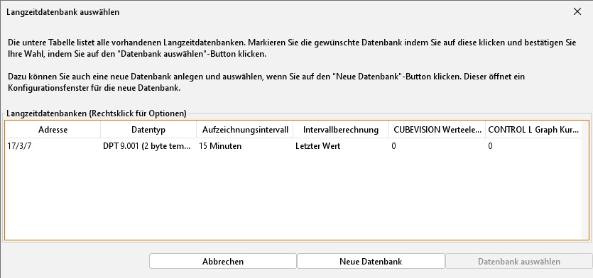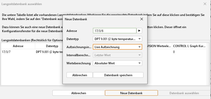 If enable that function it opens the window for managing the long-term databases, where are displayed and for selection existing long-term databases, as well as new databases can be created. Overall, the EIBPORT can manage up to 20 long-term databases. These databases get an internal database key.