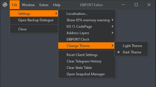 In menu item âFileâ, you can choose general settings, open the safety-dialogue or close the editor himself. (For security dialogue "Close the Editor" chapter).