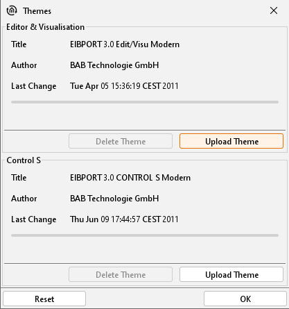 Since firmware version 0.10.1 it is available to exchange all elements and icons of the EIBPORT software by means of so-called themes. You can develop your own themes or use other existing themes. To edit themes and load them from the EIBPORT, a tool called "Theme Editor" is provided. The theme files can then be loaded into the EIBPORT via "Themes". Once a theme file has been successfully uploaded, the editor must be restarted for the changes to take effect.
