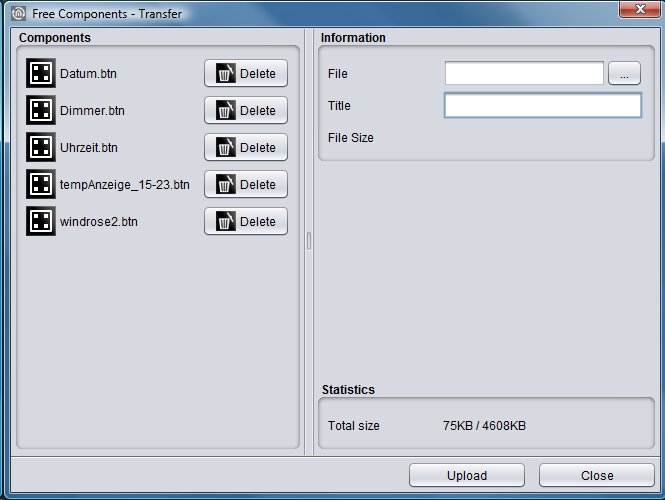 Using this dialogue, you can upload switches to EIBPORT, which were created by the COMPONENTBUILDER. COMPONENTBUILDER allows to create own switches by connecting pictures with desired functions. It is available in the download area www.bab-tec.de for free.