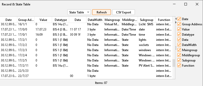This table stores the state of all given group addresses. These entries will control working of visualisation and jobs, which are arranged in your EIBPORT the last condition is determined with the aid of the telegramsâ time signature. The state table can be erased without rebooting the EIBPORT.