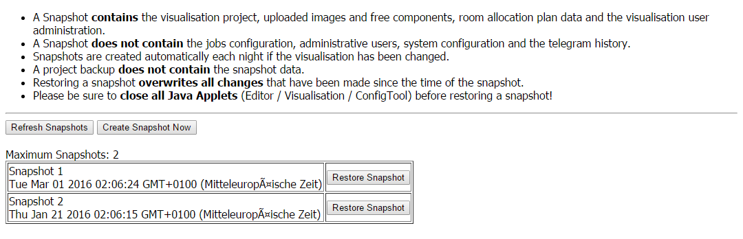 Note: The Snapshot backup only contains the visualisation data. All other data must be secured by making regular backups.