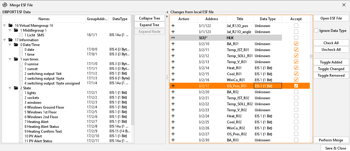 The "Merge ESF File" is divided into two halves. In the left half of the existing ESF file is displayed. In the right half of the change (not file a second ESF) which would result in merging the two files are displayed. To identify which operation is performed with which group address, the data in the column "Action" will be marked with a symbol.
