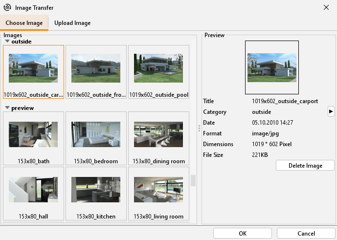 Choose Image: In this tab, all uploaded images are managed. If you mark a picture, a âPreviewâ is shown in the right window. With the help of item âcategoryâ, you can refer the image to an existing or a new category. Categories and referred pictures appear in the left-hand window. Button âDelete Imageâ erases the marked picture out of category.