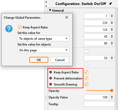 All objects and as standard value: The parameter is valid for all existing elements and is set as standard for each new/ additional object.