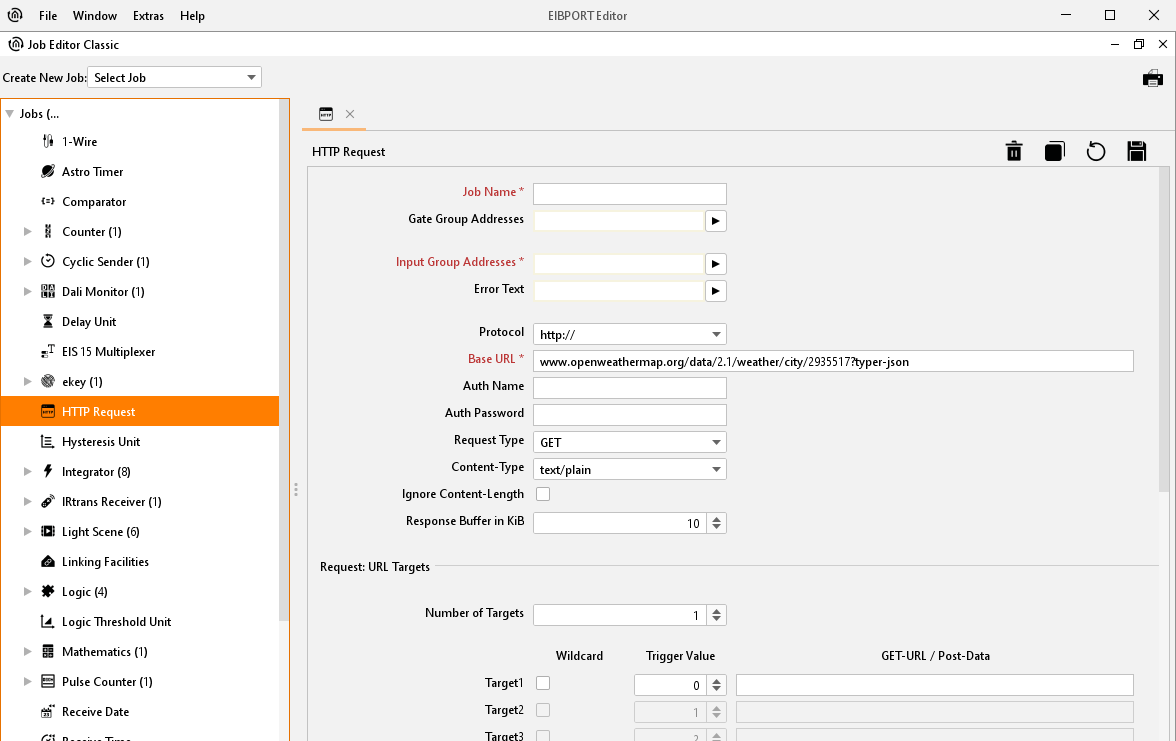Up from Firmware Version 0.11.5 the HTTP Request Job provides the possibility to interpret the response from the web server. For this the content of the response file can be searched by regular terms and so the wanted values can be filtered out. The result of the filters can be sent out on up to 4 outputs to a KNX address.