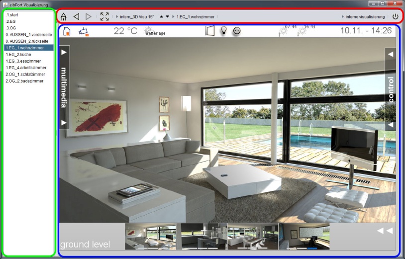 In the left window area, the project pages will be displayed. On the border of page index and visualisation, little arrows are located, which will allow you, to fade in or to fade out respective views. In case the page index is not activated in your project settings, it will not appear in visualisation.
