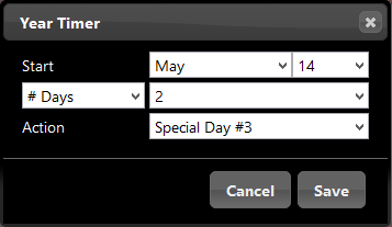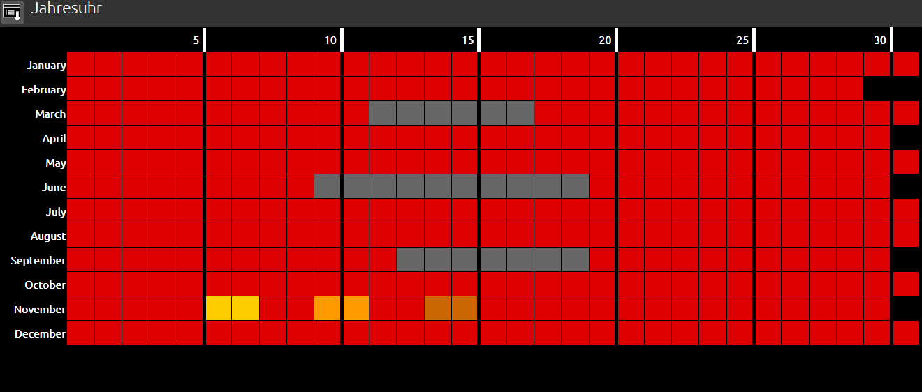 The year timer shows the complete calendar of a year. The days are represented by boxes. If you click on one of these boxes, a pop-up menu opens which can be used to set the different states.