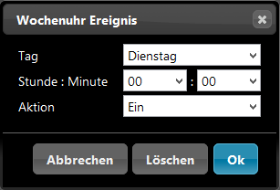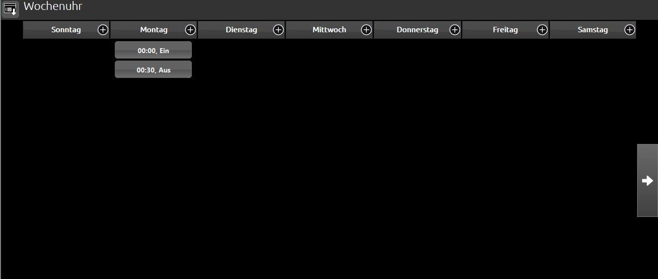 The week timer shows all days of a week and 3 additional special days in 10 columns that are arranged next to each other. You can use the arrow buttons on the left and right side of the screen, to move to the next or to previous columns. The "+" symbols next to each day can be used to create a new switching time. If you click on "+", a pop-up menu opens.