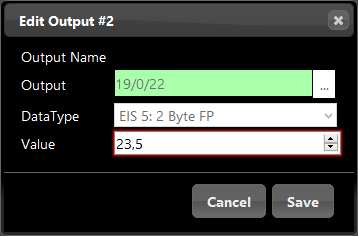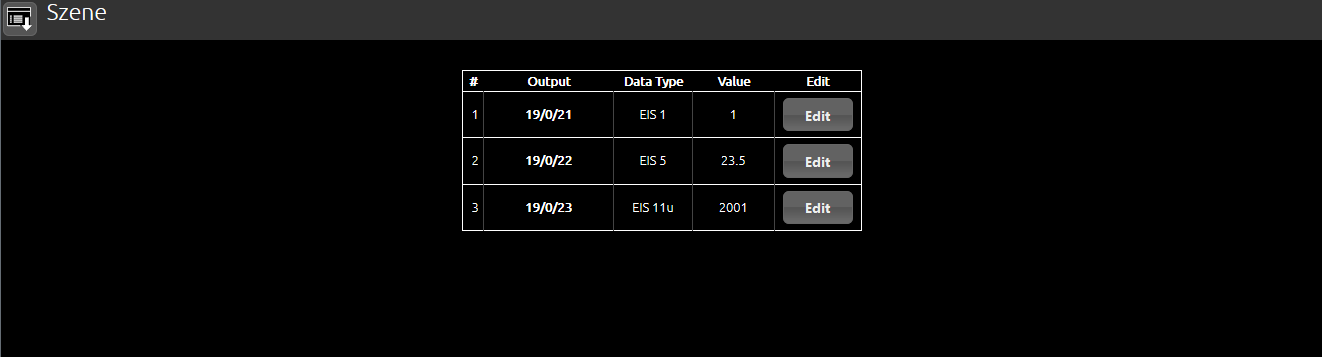 The lighting scenario configuration mask shows all outputs configured in the job. It shows the group addresses, the data type and the value. The user can only change the value by using the "Edit" function. Group address and data type cannot be modified in this mask. If you click on "Edit", a pop-up window appears in which the settings can be made.