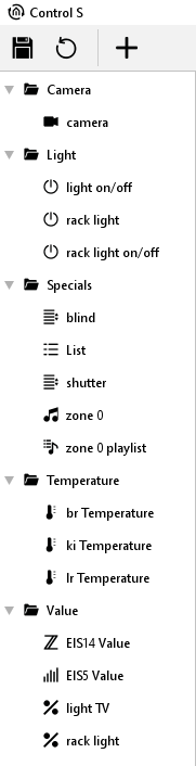 With three symbols at the head of window, the CONTROL S editor will be controlled. There you will find a button for “saving”, a symbol for „reload“ and a symbol for “new element” which allows you to add a new element into the project.