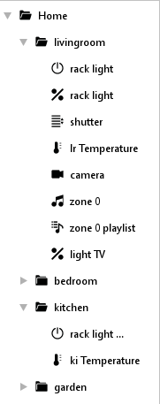 The middle column corresponds to the sight of the visualisation. The here performed arrangement will be seen later in the display of your mobile. The user can create folders by him and distribute elements at his will. You can create a folder by context menu (right click to column). Elements, which are parametrized in left column before, will be drawn simply by “drag and drop” to desired folder. Display arrangement of can happen, according to floors and rooms and/or to functions, for example.