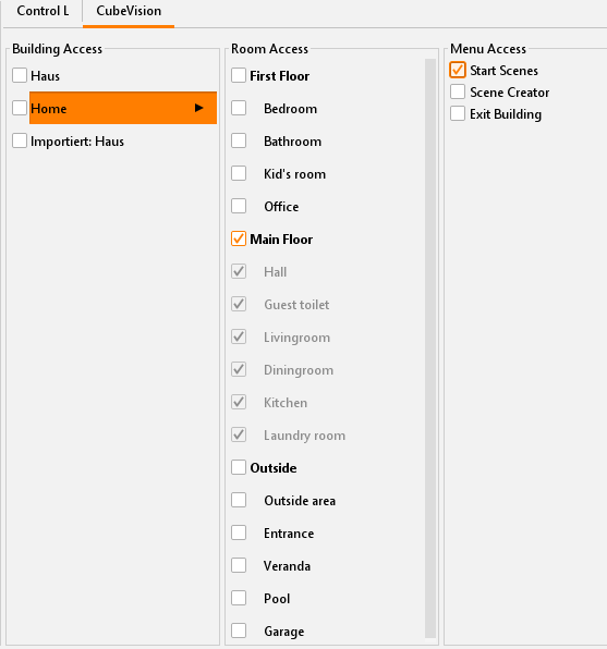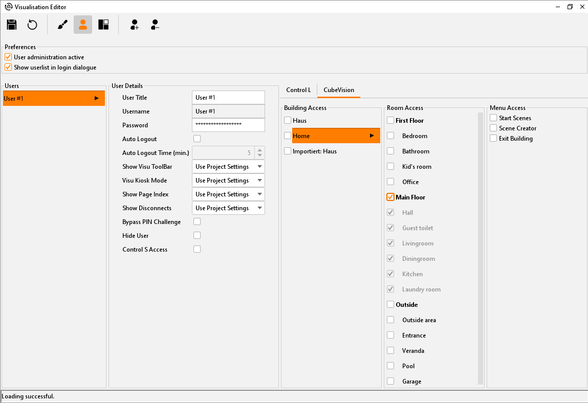 Access to all visualisation interfaces is administrated in the security settings (JAVA CONTROL, CONTROL L, CUBEVISION and CONTROL S). Access can be set up individually for each user. For CUBEVISION, CONTROL L and JAVA CONTROL, entire projects or just individual pages can be enabled.