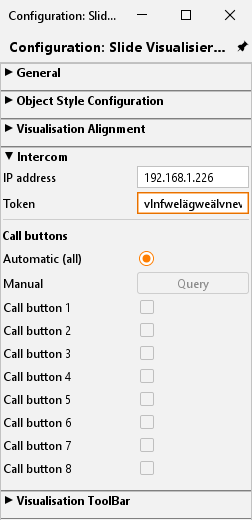 With this menu there is possibility to integrate an INTERCOM system into the visualization. The required data, interface and protocol are adapted by the INTERCOMMODULE and are available for the visualization. The configuration is transferred from the INTERCOMMODULE to the visualization by using a TOKEN.