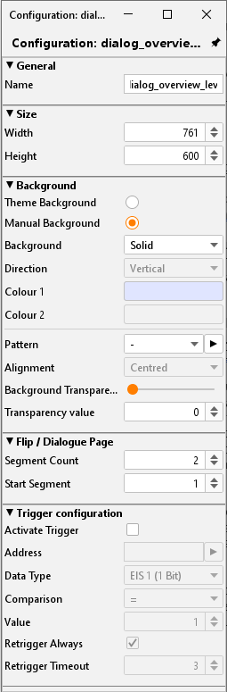 The flip / dialog page is an extra page element that makes it possible to define smaller pages that can then be pulled to an existing visualization page (requires at least 2 segments). In addition, these sites can also appear as dialog elements in the foreground. In this manner, the operation of a visualization can be greatly simplified.