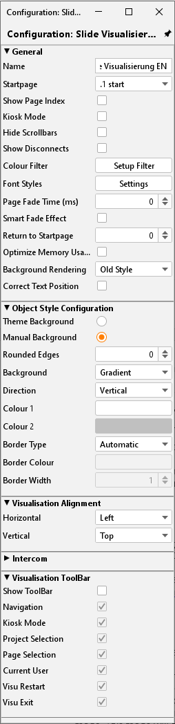Kiosk-mode: In this entry activated, visualisation starts in full-screen mode. This mode will be used especially in case visualisation is not allowed to be closed. (Official hours)