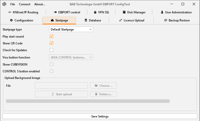 The start page is the page, which will be displayed if the address of EIBPORT is entered in the browsers’ address bar. In this tab you have the possibility to determine which behaviour takes place in this case. To use your own background image, you are able upload it into EIBPORT by function in field at the bottom.