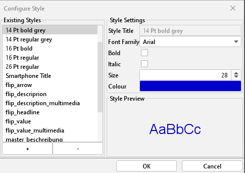 Font style, size and colour are set here. Using the dialogue “style” individual styles can be defined and used later on within the project.