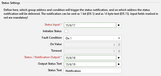 Define here which group address and conditions are to trigger the status message and via which address the status change is to be reported.