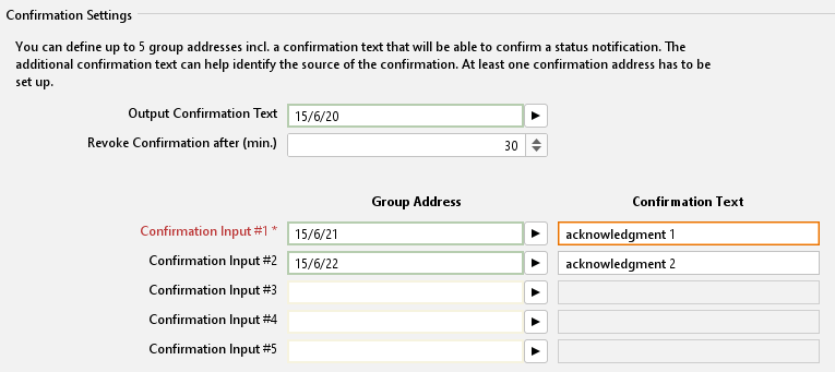You can define up to 5 group addresses incl. acknowledgement text for acknowledging the status change here. An added acknowledgement text helps you to identify the acknowledging body. At least one acknowledgement address must be defined.