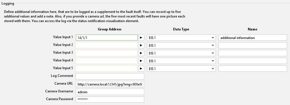 This feature can be used to define additional information which are to be included in the log. Besides the actual status events, up to 5 additional values and a comment of any type can be stored. If a camera URL is entered, one camera image is stored as well for each of the 5 most recent faults. The log data can be accessed via the "Status indicator" visualisation element. The visualisation element saves up to 100 log entries.