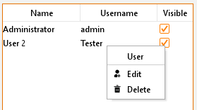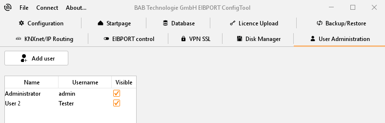 In menu you can find a table of applied user. In delivery condition only user “administrator” is entered. In the first column real name and in the second column username will be shown. Last column shows if user is visible or not. This column serves only for information. If user should be visible in selection menu of account or not, ca be defined in the user settings.