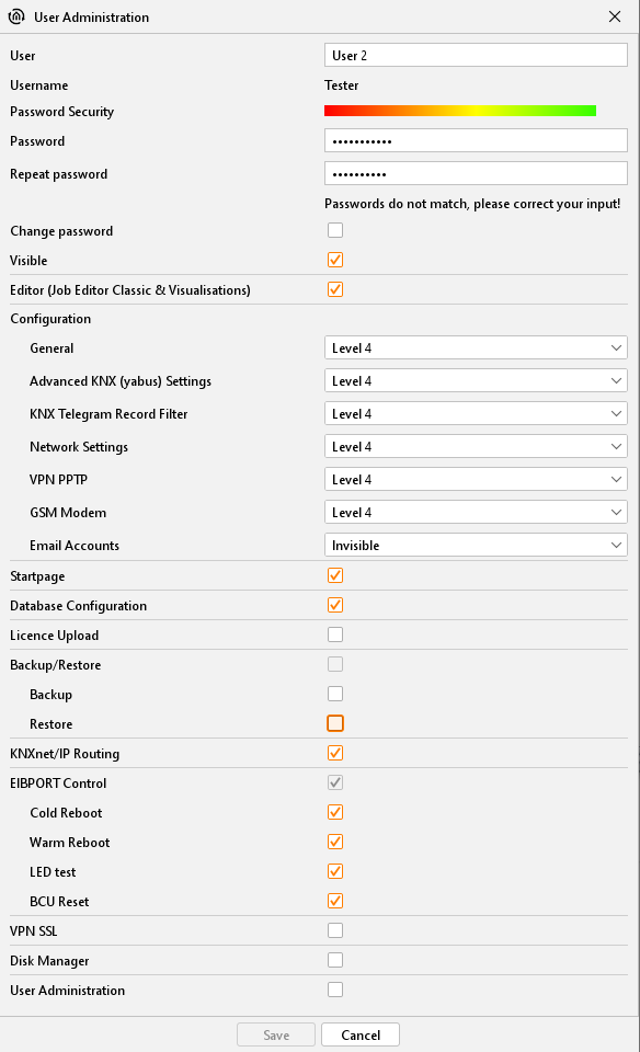 Access to the EIBPORT control. It can be set particularly, which function of four functions user is allowed to operate.