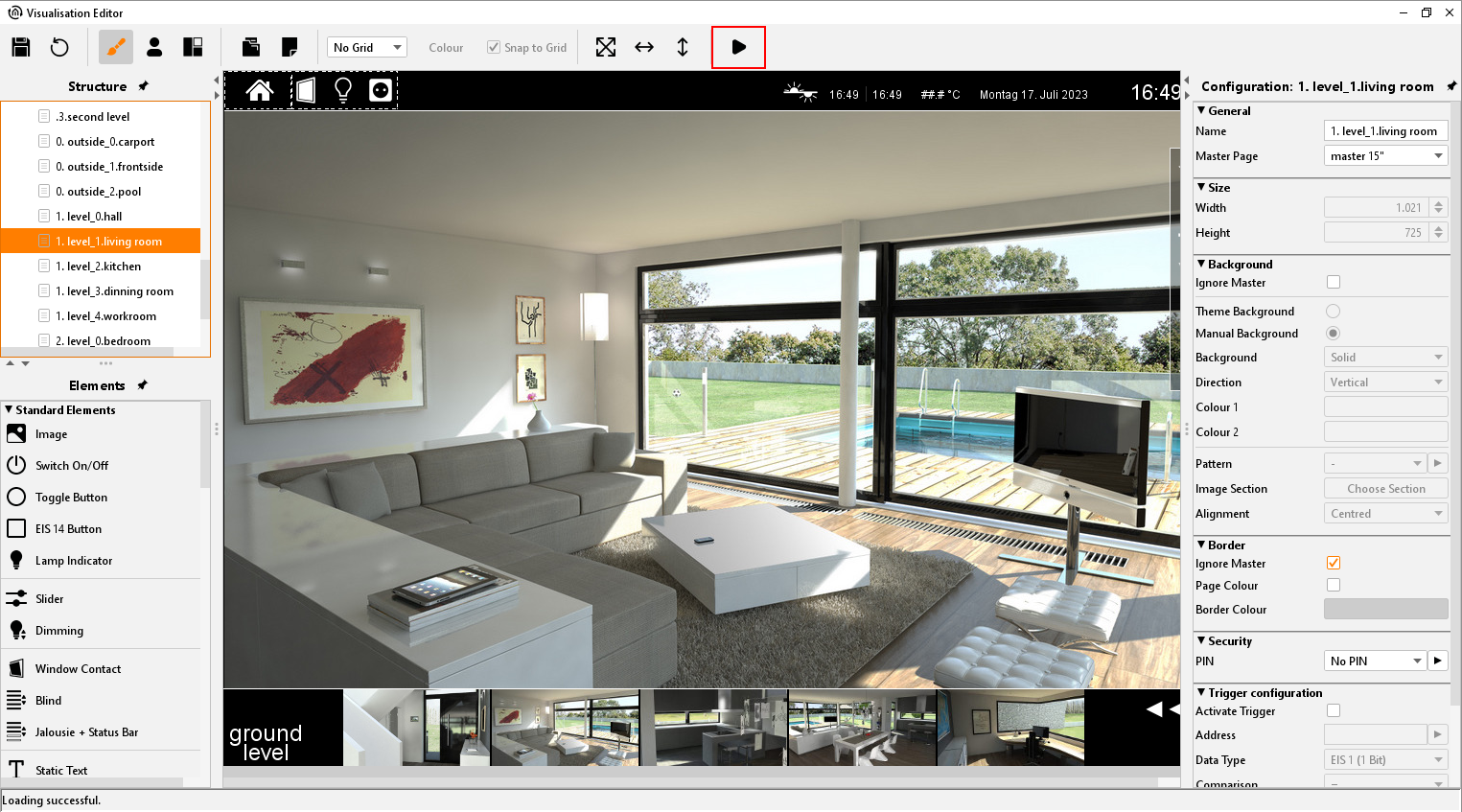 Sight and functions of visualisation will be configured by this editor. A visualisation will be created thereby with employing projects and pages. Several projects are possible. Function for visualisation could be simulated within the editor, by using the “Visu-live-mode”.
