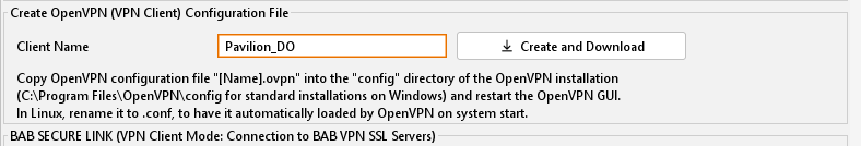 Click on "Create and download". A browser dialog opens for downloading the "*.ovpn" configuration file. Save the configuration file on your computer. At the same time, the configuration file is displayed as a known client in the "Known clients and issued certificates" list.