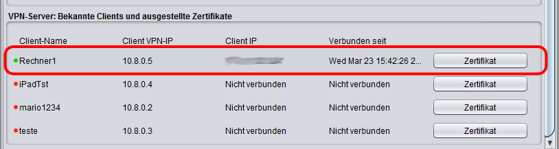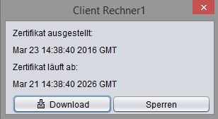 Each connected client has been allocated its own certificate by the configuration file. The certificate can be displayed using the "Certificate" button, downloaded ("Download") or blocked ("Block").