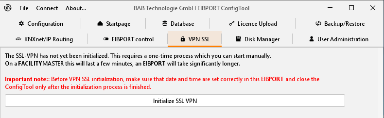 To be able to use the services relevant to VPN SSL (BAB SECURELINK, VPN Server) in the EIBPORT, the VPN server must be initialised once. To do so, click on "Start basic configuration" in the "VPN SSL" menu.