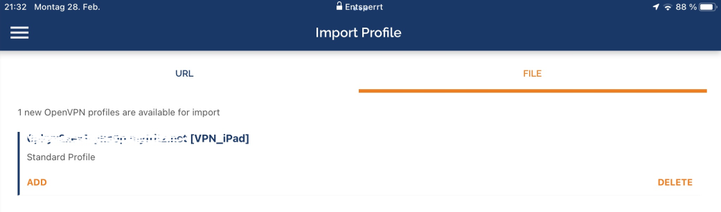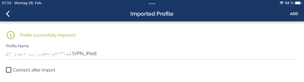 Confirm the selection of your VPN configuration file with "ADD"