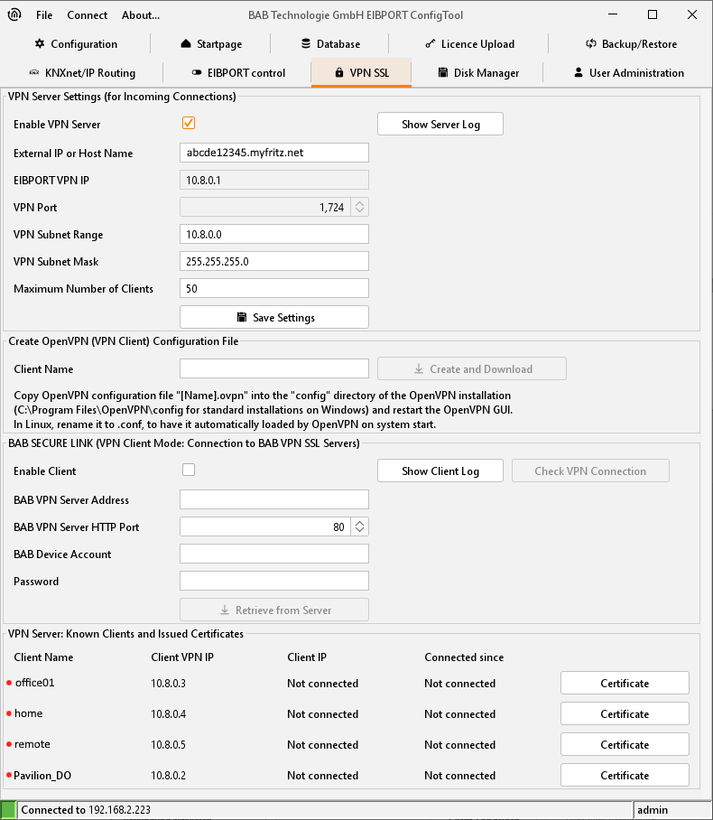 The EIBPORT can now be reached under the "EIBPORT VPN IP" (10.8.0.1 by default)!