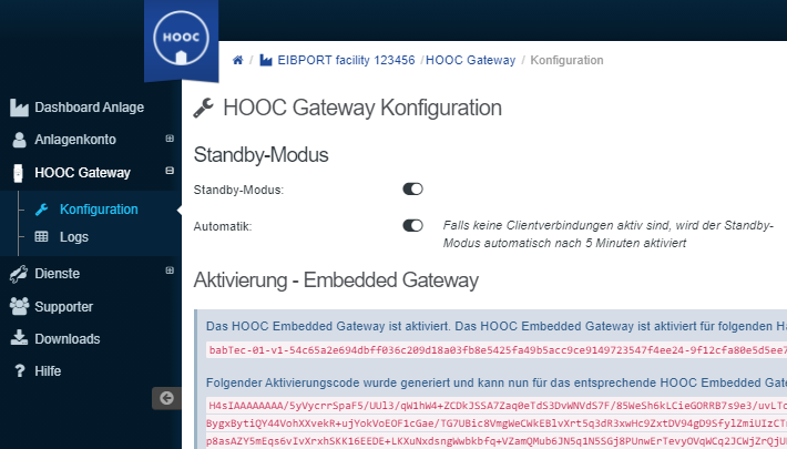 Settings for your activation can be found when you open the submenu of "HOOC Gateway". Here you can see the Hardware ID (1) and the activation key (2).