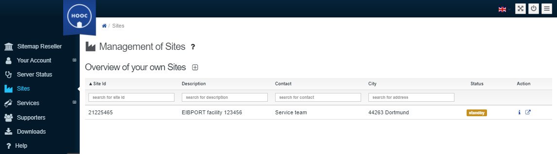 From the site facility management in your HOOC Portal account go to the desired facility. Here you open the symbol "change to the site" by Action.