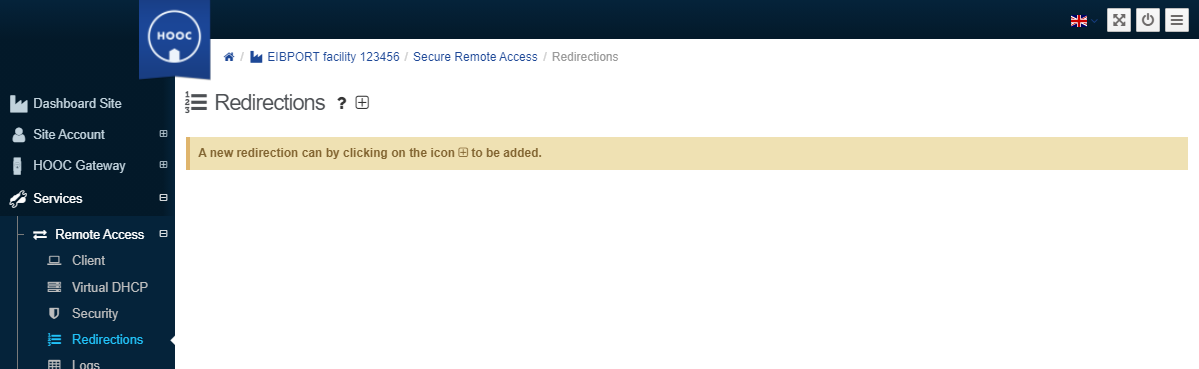 As described above, you go directly to the desired site (your EIBPORT), to the services and to the menu item "Redirections" via the management of sites.