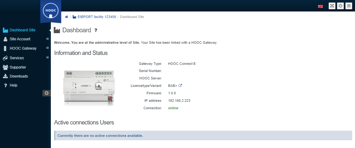 It opens the window of your selected facility. Here you can see the status of the device. The extension icon "License Type" lists the characteristics of your license.