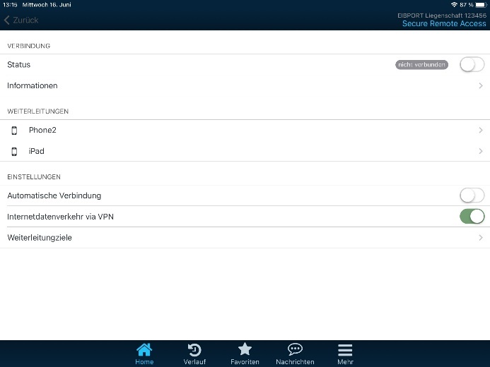 If the connection to the EIBPORT (Gateway) enabled, the extension menu is hidden. Thus, you must first deactivate the connection status. Then the extension menu will be displayed and you can activate "Auto Login".