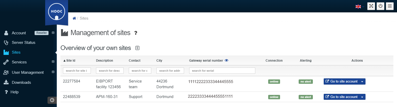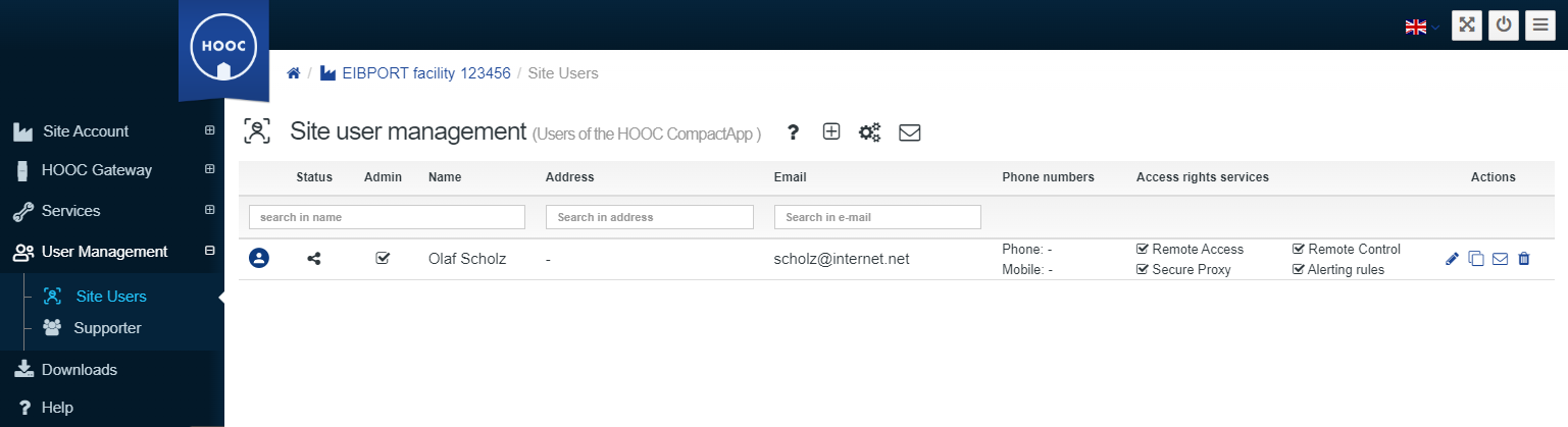 In the administration for the Site Users, you will find users already created for the HOOC Compact APP. Assigned access authorisations and activated services for the respective users are displayed. You can