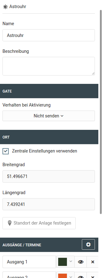 The coordinates are decisive for proper functionality of the Astrotimer. They determine the angle at which the sunlight hits the earth and hence are relevant for proper calculation of sunrise and sundown. By default, the coordinates that you set up for your device at "System > Settings" will be used. However, if this logic group for instance controls a remote facility via facility coupling, you can enter the coordinates of that remote location here.