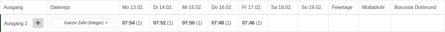 This input starts the execution of an event with special day function Special Calendar manually. By specifying a value of 1-10 depending on the order of the calendars in the special day calendar configuration, the respective special day configuration is actuated. The astrotimer then executes all outputs with a defined event on the corresponding special day. The execution will overwrite the normal mode of operation until the respective value is present in the input. A value of <> 1-10 terminates manual special day execution.