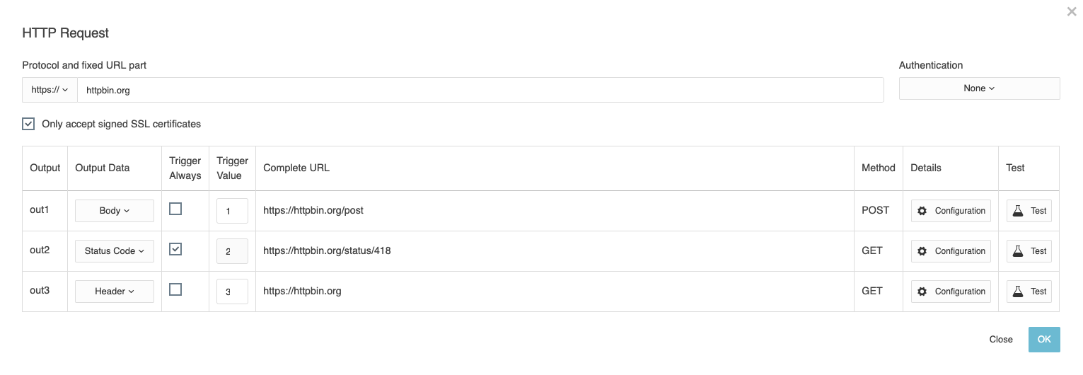 Every output corresponds one of the up to 20 configurable HTTP requests
