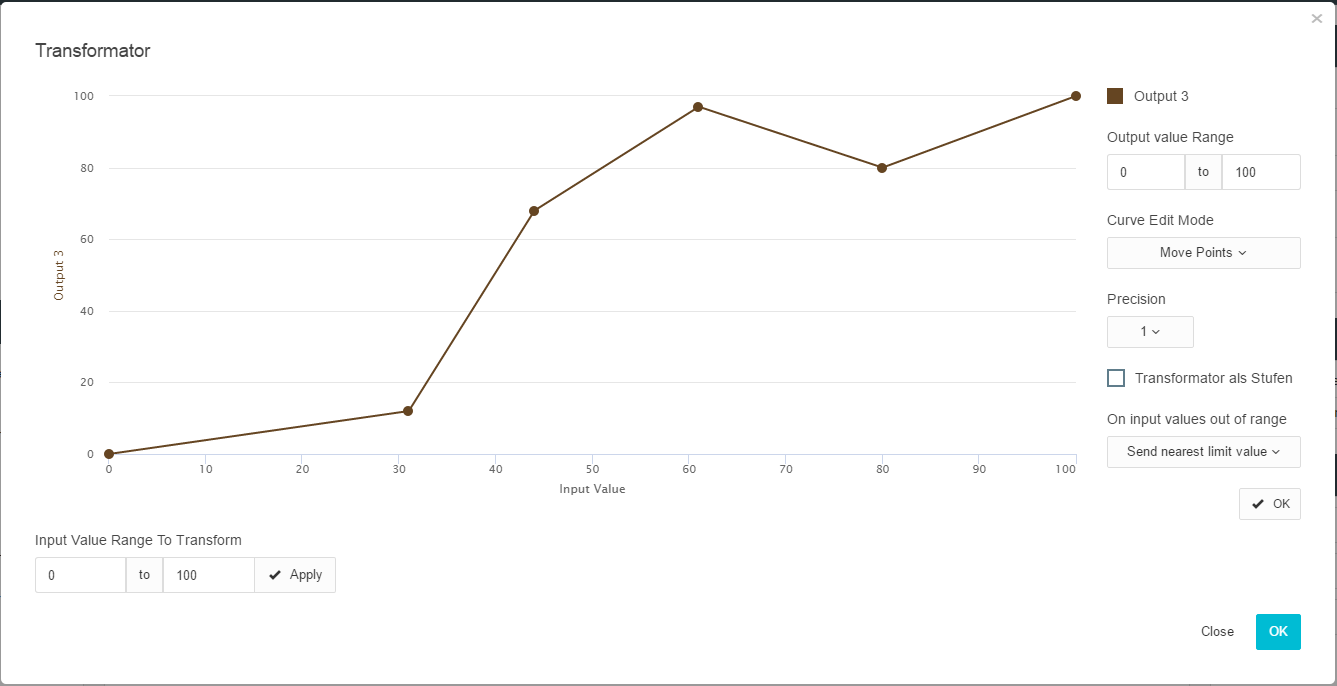With the transformator, you can depict input values for a specific value range on another value range. A frequent case of use is the transformation between two value ranges. One straightforward example is the conversion of DPT 5.001 (0-100%) into DPT 5.010 (0-255). A straightforward linear transformation can be carried out without an appropriate graphic interface, but it can also be easily achieved with the Mathematics. The transformator is therefore to be used with not absolutely linear transformations. By way of example, a rudimentary constant light regulation on the basis of the data of a LUX sensor.