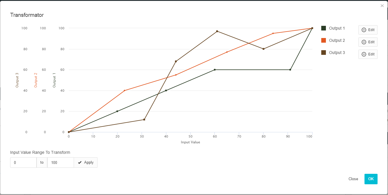 The input value range (x-axis) is defined via the input field situated below. An individual output value range (y-axis) can be created for every output, and therefore an individual graph.